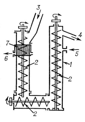 Рис. 5. Непрерывный противоточный экстрактор: 1 — корпус; 2 — перфорированные шнеки; 3 — ввод твердой фазы; 4 — отвод твердой фазы; 5 — ввод экстрагента; 6 — отвод экстрагента; 7 — процеживатель.