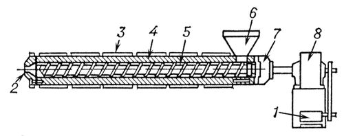 Схема одношнекового горизонтального экструдера: 1 — двигатель; 2 — экструзионная головка; 3 — нагреватель корпуса; 4 — корпус; 5 — шнек; 6 — загрузочное устройство; 7 — упорный подшипник; 8 — редуктор.