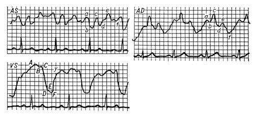 Электрокимограмма здорового человека: AS — левого предсердия; AD — правого предсердия; VS — левого желудочка; латинскими буквами обозначены отдельные элементы кривых.