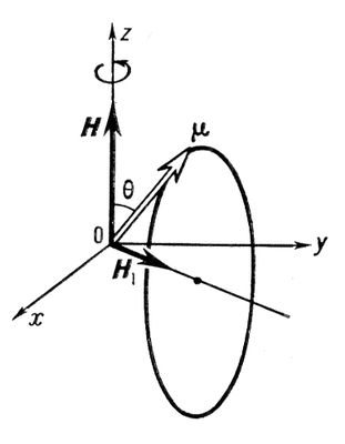 Здесь g — гиромагнитное отношение. Угол прецессии q (угол между векторами Н и m) при этом остаётся постоянным. Если систему поместить в магнитное поле H1^H, вращающееся вокруг Н с частотой v, то проекция вектора m на направление поля Н будет изменяться с частотой v1 = gH1/2p. Это изменение проекции m с частотой v1 под действием радиочастотного поля H1 (рис. 1) имеет резонансный характер и обусловливает ЭПР. При исследовании ЭПР обычно используют линейно поляризованное переменное магнитное поле, которое можно представить в виде суммы двух полей, вращающихся в противоположные стороны с частотой v. Одна из компонент, совпадающая по направлению вращения с прецессией, вызывает изменение проекции магнитного момента m на Н.