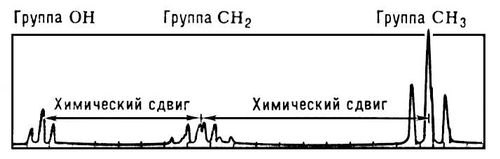 Спектры ЯМР в подвижных жидкостях для ядер со спином I = 1/2 и Q = 0 отличаются узкими линиями (ЯМР высокого разрешения). Спектры высокого разрешения получаются для протонов, ядер 19F, 13C, 31P и некоторых других ядер. Одиночные линии в этом случае получаются только если наблюдается ЯМР ядер, занимающих химически эквивалентные положения (например, линии водорода в спектрах воды, бензола, циклогексана). Все соединения более сложного строения дают спектры из многих линий (рис. 3), что связано с двумя эффектами. Первый, так называемый химический сдвиг, — результат взаимодействия окружающих ядро электронов с полем H0.