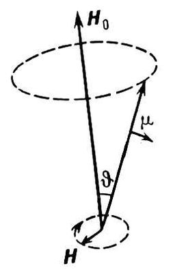 ЯМР, как и другие виды магнитного резонанса, можно описать классической моделью гироскопа. В постоянном магнитном поле H0 пара сил, обусловленная магнитным моментом m, вызывает прецессию магнитного и механического моментов, аналогичную прецессии волчка под действием силы тяжести. Магнитный момент m прецессирует вокруг направления H0 с частотой w0 = gH0, угол прецессии d остаётся неизменным (рис. 1). В результате воздействия радиочастотного поля H1 резонансной частоты w0 угол d изменяется со скоростью gН1рад/сек, что приводит к значительным изменениям проекции m на направление поля H0 даже в слабом поле H1.