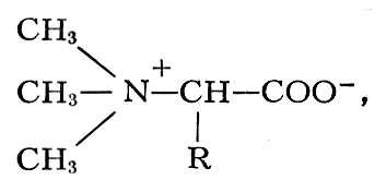 кристаллические вещества. Бетаины — внутренние соли триалкилзамещённых аминокислот. Молекула бетаина содержит положительно заряженный четвертичный атом азота и отрицательно заряженную карбоксильную группу, представляя собой, т. о., биполярный ион. Бетаины хорошо растворимы в воде. С рядом кислот и с хлоридами тяжёлых металлов бетаины образуют нерастворимые соединения (например, золото-, платино-, свинцовохлористоводородные соли). Эту реакцию используют для их выделения. Бетаины распространены в животном и растительном мире. Их получают действием алкилгалогенидов или алкилсульфатов на аминокислоты и др. способами.