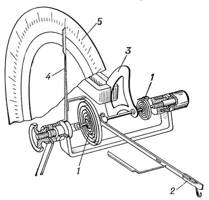 Рис. 8. Схема крутильных (торзионных) весов: 1 — спиральные пружины; 2 — рычаг для помещения нагрузки; 3 — магнитный ускоритель; 4 — стрелка; 5 — шкала.
