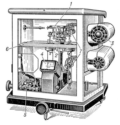 Рис. 4. Равноплечные двухчашечные микроаналитические весы (предельная нагрузка 20 г): 1 — коромысло; 2 — воздушные успокоители; 3 — механизмы наложения встроенных гирь (от 1 до 999 мг); 4 — экран, на который проектируется шкала отсчёта; 5 — манипулятор, выдвигающий чашку весов в окошко; 6 — перегородка, защищающая коромысло от температурных влияний и воздушных потоков; 7 — встроенные гири, имеющие вид колец.
