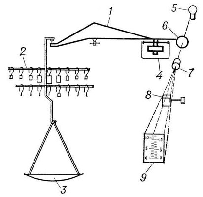 Рис. 5. Схема одноплечных аналитических весов: 1 — коромысло; 2 — встроенные гири; 3 — грузоприёмная чашка; 4 — противовес и успокоитель; 5 — источник света; 6 — проекционная шкала; 7 — объектив; 8 — устройство для коррекции нуля; 9 — экран.