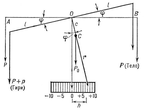 где P0 — вес коромысла со стрелкой, с — расстояние между центром тяжести коромысла и осью его вращения, l — длина плеча коромысла, g — ускорение