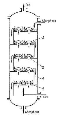 Более сложен абсорбер представляющий собой колонну (рис. 2), в которой вместо решёток и насадки установлены тарелки 1, снабженные патрубками 2, колпачками 3 с зубчатыми краями и переливными трубками 4. Абсорбент стекает с тарелки на тарелку по переливным трубкам, а смесь газов движется снизу вверх, барботируя через слой жидкости. При прохождении между зубьями колпачков газовый поток разбивается на множество мелких пузырьков, что обеспечивает большую поверхность соприкосновения газа и жидкости. В ряде случаев вместо тарелок с колпачками устанавливаются тарелки, в которых просверлено большое число отверстий — ситчатые тарелки.