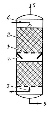 Абсорбер, основной аппарат установки, в которой осуществляют абсорбцию. В абсорбере (часто называется также скруббером) создают развитую поверхность соприкосновения газа и жидкости. Известно несколько типов абсорберов. Насадочный абсорбер (рис. 1) представляет собой металлическую или керамическую колонну, внутри которой имеется несколько горизонтальных решёток 1 с расположенными на них слоями насадки 2 (кокс, металлические или керамические кольца, деревянные решётки, камни и др.), предназначенной для увеличения поверхности соприкосновения газа с жидкостью. Смесь газов поступает в нижнюю часть колонны по трубопроводу, а абсорбент, подаваемый по трубе 4, стекает вниз по насадке навстречу поднимающейся смеси газов. В результате противоточного контактирования газа и жидкости происходит наиболее полное растворение поглощаемых компонентов газовой смеси в абсорбенте. Непоглощённые компоненты газовой смеси удаляются из абсорбера по трубопроводу 5, а насыщенный абсорбент вытекает снизу по трубопроводу 6. Конусы 7 между секциями насадки 2 направляют абсорбент, вытесняемый газом к стенке абсорбера, к центру для более равномерного орошения.