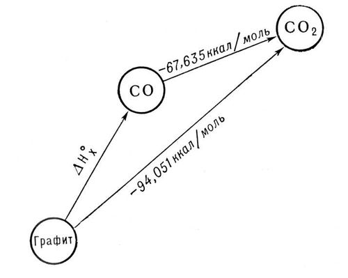 окиси углерода и графита до CO2 при этой температуре равны соответственно —282,99 и —393,32 кдж/моль (—67,635 и—94,051 ккал/моль). Рассматривая два пути образования CO2 из графита при непосредственном сжигании его до CO2 и при промежуточном образовании СО (см. рис.) и зная, что по Гесса закону общий тепловой эффект обоих путей перехода должен быть одинаковым, находим