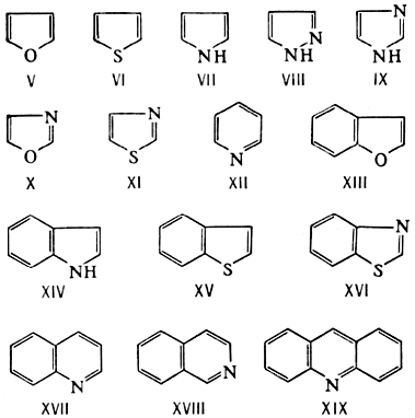 Ароматичность проявляется у гетероциклических соединений (главным образом 5- и 6-членных), содержащих, подобно другим ароматическим соединениям, замкнутую систему 4n+2 p -электронов. Химия таких гетероциклических соединений, сохраняя известное сходство с химией ароматических соединений бензольного ряда, определяется в основном специфическим характером каждого гетероциклического ядра. К важнейшим ароматическим гетероциклическим соединениямотносятся фуран (V), тиофен (VI), пиррол (VII), пиразол (VIII), имидазол (IX), оксазол (X), тиазол (XI) и пиридин (XII). Большое значение имеют также гетероциклические соединения, конденсированные с бензольными ядрами, — бензофуран (кумарон; XIII), бензпиррол (индол; XIV), бензтиофен (тионафтен; XV), бензтиазол (XVI), бензпиридины — хинолин (XVII) и изохинолин (XVIII), дибензпиридин (акридин; XIX):