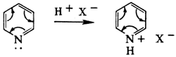 В 6-членных гетероциклах неподелённая электронная пара гетероатома не участвует в образовании ароматической системы связей. Поэтому пиридин — гораздо более сильное основание, чем пиррол, и с кислотами образует устойчивые соли: