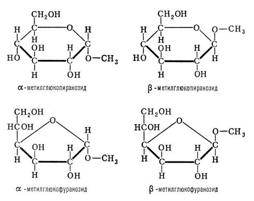 Гликозидные связи образуются между ацетальным гидроксилом сахара и спиртовой группой неуглеводного компонента, т. н. агликона (при отщеплении молекулы воды). В зависимости от участия атомов S, О или N в образовании гликозидной связи различают S-, О- или N-гликозиды. Две последние группы гликозидов наиболее распространены в тканях растений и животных, a- и b-гликозиды различаются пространств. положением агликона по отношению к плоскости кольца углеводного компонента; их гидролиз протекает при участии ферментов a и b-гликозидаз. Классификацию гликозидов затрудняет разнообразие веществ, выступающих в роли агликона, определяющего специфическое биолгическое действие гликозидов. Содержащие глюкозу гликозиды называются глюкозидами. К гликозидам, содержащим дисахаридные остатки, относятся кроцин (содержащий генциобиозу) и ксанторамнин (рамнозу). Полисахариды, также образуемые гликозидными связями, часто относят к гликозидам, а ферменты, их расщепляющие (например, амилазу), — к гликозидазам. Многие гликозиды — красящие вещества. Ряд гликозидов обладает значительной биологической активностью и применяется в медицине и биологии. Т. н. сердечные гликозиды, содержащиеся в растениях наперстянке, ландыше, строфанте и др., вызывают изменения сердечной деятельности; их применяют при заболеваниях сердца, они повышают сократительную способность сердечной мышцы, усиливают и укорачивают систолу, удлиняют диастолу, что ведет к улучшению кровоснабжения сердца и устраняет застойные явления. В эксперименте гликозид флоридзин используют для вызывания гликозурии; гликозид сапонин вызывает гемолиз эритроцитов. Важную роль в организме играют гликозиды, образуемые при соединении сахаров рибозы и дезоксирибозы с азотистыми основаниями, — т. н. нуклеозиды. Их фосфорные производные — нуклеотиды — участвуют в построении нуклеиновых кислот, а также являются коферментами.