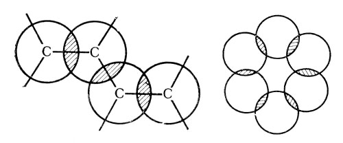 Если три двойных связи сопряжены в шестичленном цикле, то секстет p-электронов становится общим для всего цикла и образуется относительно стабильная ароматическая система (см. рис. 2, справа). Присоединение к подобным соединениям как электрофильных, так и нуклеофильных реагентов энергетически затруднено. (См. также Химическая связь.)