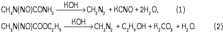 Диазометан получают обычно действием щёлочи на нитрозометилмочевину (1) или нитрозометилуретан (2):