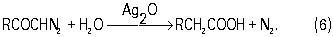 Без выделения азота диазометан взаимодействует, например, с галогенангидридами карбоновых кислот с образованием диазокетонов. При разложении последних в присутствии воды, спиртов или аминов и катализатора (Ag2O) происходит перегруппировка с образованием кислоты (её эфира или амида) с числом атомов углерода, на единицу большим, чем в исходном хлорангидриде (реакция Арндта — Эйстерта):
