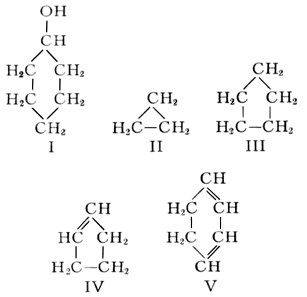 Многочисленные алициклические соединения различаются между собой числом колец и их взаимным расположением, числом атомов углерода в циклах, наличием простых или кратных связей между атомами углерода, функциональными группами. Так, известны моно-, би-, три- и полициклические алициклические соединения. Циклопропан (II) содержит 3 атома углерода в цикле, циклопентан (III) — 5, циклогексан — 6 атомов углерода. В отличие от соединений I — III, принадлежащих к циклоалканам, циклопентен (IV) и циклогексадиен (V) — типичные представители ненасыщенных алициклических соединений с различным числом двойных связей.