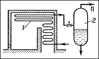 Равновесная дистилляция (однократное испарение) характеризуется испарением части жидкости и продолжительным контактом паров с неиспарившейся жидкостью до достижения фазового равновесия (рис. 4). Разделяемая смесь проходит по трубам 1, обогреваемым снаружи топочными газами. Образовавшаяся при этом парожидкостная смесь, близкая к равновесному состоянию, поступает в сепаратор 2 для механического отделения жидкости от пара. Пары (П) из сепаратора поступают в конденсатор, откуда дистиллят стекает в приёмник, а оставшаяся в сепараторе жидкость отводится в сборник. В этом процессе соотношение между паром и жидкостью определяется материальным балансом и условиями фазового равновесия. Равновесная дистилляция редко применяется для двухкомпонентных смесей; хорошие результаты получают в основном в случае многокомпонентных смесей, из которых можно получить фракции, сильно различающиеся по составу.