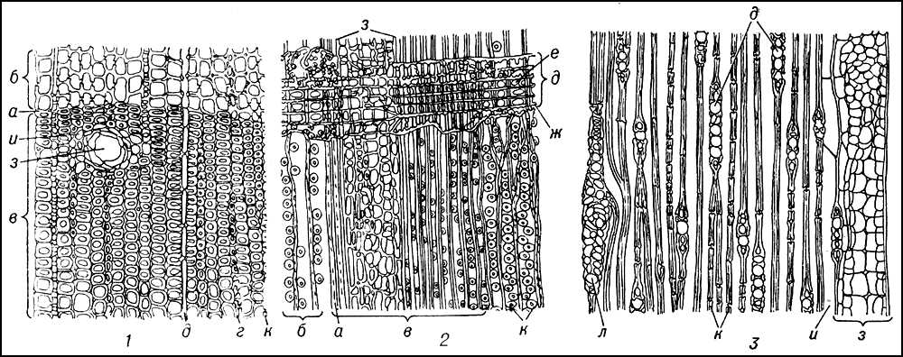Рис. 4. Участки срезов древесины сосны: 1 — поперечного; 2 — радиального; 3 — тангенциального; а — граница годичного кольца; б — поздняя древесина; в — ранняя древесина: г — новый ряд вклинивающихся трахеид; д — гетерогенный сердцевинный луч, состоящий из лучевых трахеид (е) с мелкими окаймленными порами и паренхимных клеток с большими окновидными порами (ж); з — смоляной ход (хорошо видны выстилающие его эпителиальные клетки); и — клетки паренхимы, окружающие смоляной ход; к — окаймленные поры; л — сердцевинный луч с горизонтальным смоляным ходом.