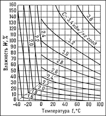 Рис. 6. Зависимость удельной теплоёмкости древесины С от температуры t и влажности W.