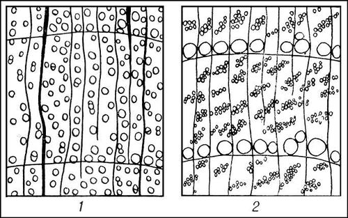 Рис. 3. Схема расположения сосудов древесины на поперечном сечении годичного кольца: 1 — клёна (рассеянно-сосудистая); 2 — вяза (кольцесосудистая).
