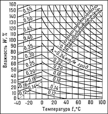 Рис. 7. Зависимость коэффициента теплопроводности древесины lном от температуры t и влажности W.