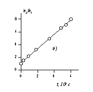 Рис. 2.25. Кинетические кривые коагуляции: а- порядок частиц (1 - суммарное число частиц, 2 – первый, 3 – второй, 4 – третий); б- кинетическая кривая, линейная форма уравнения Смолуховского |