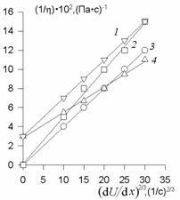На рис. 2.47 показаны кривые течения некоторых загусток в координатах уравнения (2.4.65). Отрезок, отсекаемый на оси ординат при g®0, соответствует величине (1 /h0 ), т.е. текучести без разрушения структуры.