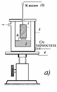 Отклонение формы мениска от сферической можно учитывать с помощью уравнения Рэлея, справедливого при r< Рис. 1.6. Схема прибора для определения поверхностного натяжения методом капиллярного поднятия (a), мениск жидкости в узком (б) и в широком (в) капиллярах Первый член разложения соответствует простому уравнению (1.1.41), второй - учитывает массу жидкости в мениске, форма которого предполагается сферической, а третий - отклонение формы мениска от сферической. Хаган и Дизайненс при решении задачи для эллиптического мениска пришли к аналогичному уравнению: Для узких трубок поправки, рассчитанные по уравнениям (1.1.42), (1.1.43) и (1.1.44), соответственно составляют 1,005; 1,006617 и 1,006623, что коррелирует с погрешностью определения h порядка 10-6м. Решение задачи введения поправок на отклонение от сферичности для широких капилляров привело Рэлея к выводу, что для воды необходима трубка с диаметром 5 см, чтобы исключить капиллярное поднятие. Для капилляров промежуточного размера используют поправки Бешфорта и Адамса. Если рассматривать фигуру вращения, приведенную на рис. 1.6, в, в точке пересечения мениска с его осью, т.е. при капиллярном поднятии на его дне, то оба радиуса кривизны должны быть равны (r1=r2). Обозначим в точке z r1=r2=b. Тогда При z=0 DP=2s/b, а при любом другом значении z изменение давления DP=Dgz. Бешфорт и Адамс для расчета поправок предложили использовать уравнения в безразмерной форме: где j - угол, дополняющий угол смачивания до 90o. Числовые решения уравнения (1.1.46) были проведены Бешфортом и Адамсом и приведены в виде таблиц для различных b и j. Эти таблицы позволяют внести поправки при расчете поверхностного натяжения по экспериментально измеренным радиусам капилляров, плотности жидкостей и воздуха, высоте подъема жидкостей по капиллярам и уточнить значения радиуса кривизны мениска и поверхности натяжения. Рис.1.7. Схема прибора для определения поверхностного натяжения методом Вильгельми (а), схема цилиндрического мениска у вертикальной пластинки (б), пластинка, подвешенная в жидкости (в).