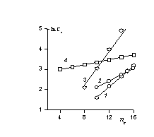 Рис. 2.59. Влияние длины углеводородного радикала на ККМ различных гомологических рядов ПАВ при 25oC: 1- RxOSO3Na; 2- Rx(OC2H4)2OSO3Na; 3- Rx(OC2H4)6OH; 4- RxM(C2H4О)2CH3. M = -O(O)C-CH=CH-C(O)-O- |
