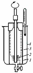 Схема такого прибора приведена на рис. 2.69. Прибор состоит из мерного сосуда 1, помещенного внутри него сетчатого цилиндра 3 и полимерной щетки 2, вращающейся от электромотора. Сосуд помещен в термостат 4, с помощью которого можно поддерживать температуру до 90°С. В результате трения вращающейся щетки о стенки сетчатого цилиндра раствор, заливаемый в мерный сосуд, вспенивается. Детальное изучение метода показало, что этот прибор может найти широкое применение, так как позволяет проводить исследования в присутствии веществ, подавляющих пенообразование, например жиров.