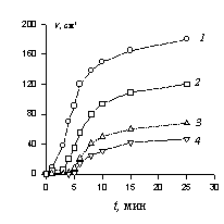 Концентрация ПАВ,%: 1 – 0,3; 2 – 0,5; 3 – 1;4 – 3. На первой стадии послеобразования пены преобладают капиллярные силы (rg<- дрП/дh), под действием которых происходит перетекание жидкости из пленок в каналы Плато – Гиббса. Такое перераспределение жидкойфазы внешне выражается в «задержке» истеченияжидкости, которая в работе названа периодом накопления. Этот период характеризуется интенсивным укрупнением пузырьков в результате диффузии газа и расширением каналов Плато–Гиббса. Период «задержки» включает также время, необходимое для накопления жидкости в нижнем сечении пенного столба. Продолжительность «задержи» увеличивается с ростом кратности пены и уменьшается (до критического значения) с увеличением ее столба.