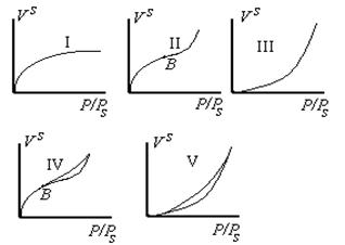 Анализ изотерм адсорбции указывает, что процесс адсорбции во многих случаях не ограничивается образованием монослоя и уже при сравнительно низких значениях относительного давления Р/Рs > 0,1 образуются, как правило, полимолекулярные слои. Брунауэр, Демминг, Демминг и Теллер выделили пять основных типов изотерм адсорбции газов на твердых адсорбентах, приведенных на рис. 1.28.