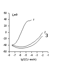 Риc. 1.44. Зависимоcть z-потенциала волокна капрон от концентрации электролитов. Электролиты: 1 – AlCl3; 2 –Na2SO4; 3 – NaCl |