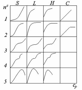 На основе анализа формы начального участка выделены 4 характерных класса изотерм. Деление изотерм на типы проводится на основании изменения формы кривой при более высоких концентрациях. Наиболее общим является класс L (класс изотерм Ленгмюра), на начальном участке изотермы этого класса выгнуты относительно оси концентраций. Изотермы L-2 характерны насыщением адсорбционного слоя при определенной концентрации, выше которой адсорбция достигает предела. Если адсорбция продолжается и после насыщения монослоя, то возможны изотермы L-3, которые при насыщении адсорбционного слоя и появлении второго плато переходят в изотермы L-4. Для изотермы L-5 характерно наличие максимума. Как правило, это возможно в результате какого-либо изменения, происходящего с растворенным веществом, например, при мицеллообразовании или при наличии примесей высокоактивных веществ, находящихся в виде ассоциатов с другими молекулами.