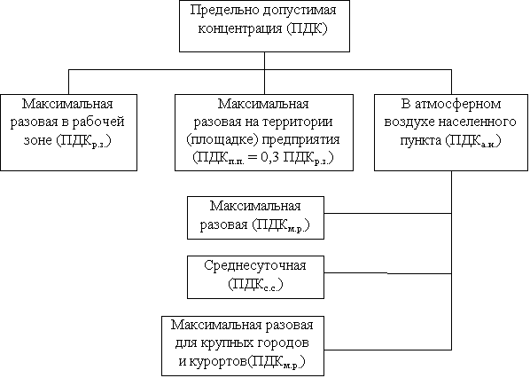 Гигиеническое нормирование сталкивается с существенными затруднениями организационного, технического и физиологического характера. Экологическая ниша человека неизменна, поэтому условие - концентрация загрязняющего вещества должна быть меньше или равна ПДК - должно соблюдаться в любых местах пребывания человека. Это означает, что для каждого вредного вещества устанавливается несколько максимальных разовых предельно допустимых концентраций в воздушной среде, классификация которых приведена на рис.6.1.