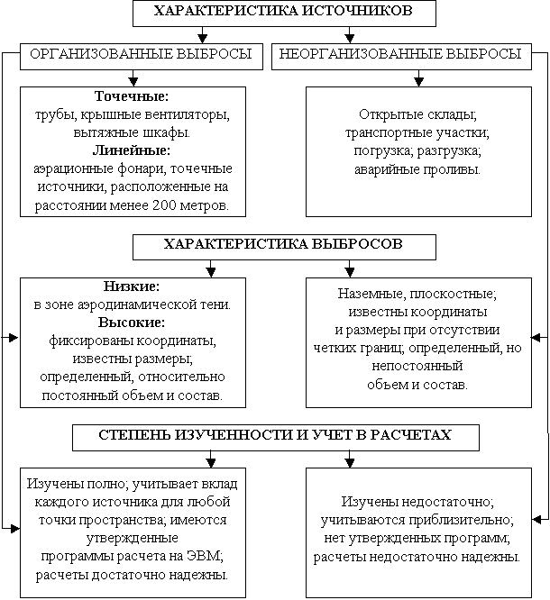 Организованные выбросы обычно производятся из стационарных источников. Их характеризует большая высота труб (50–100 м), а также значительные концентрации и объемы. Неорганизованные выбросы проявляются в виде поступлений токсикантов в атмосферу из производственных помещений предприятий. Концентрация и объем загрязняющих веществ меньше, высота выброса небольшая. Распределенные выбросы связаны в основном с транспортом, а также с обработкой сельскохозяйственных территорий ядохимикатами.