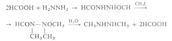 оксиэтил- и др. функционально замещенные алкилгидразины, а также гидразоны и гидразиды к-т. Алкилирование гидразина приводит сначала к монозамещенному продукту, к-рый, однако, легко превращается в несим-диалкилгидразин. сим-Диалкилгидразины синтезируют из вторичных гидразидов муравьиной к-ты по схеме: