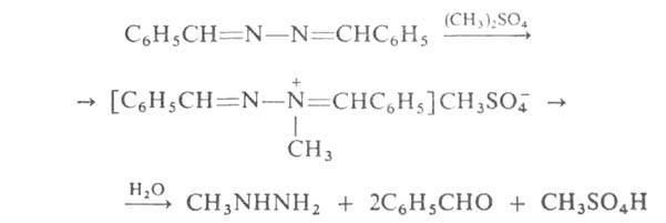Азины тем же путем м. б. превращены в сим-диалкил(арил)гидразины, а метилированием с послед. гидролизом - в метилгидразин, напр.: