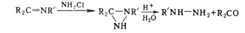 Моно- и дизамещенные гидразины синтезируют также через диазиридины, легко получаемые из оснований Шиффа и хлорамина (способ Бергбау - Бауэра) или непосредственно из подходящего кётона, амина и газообразного хлора, напр.: