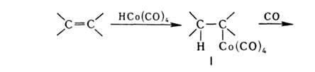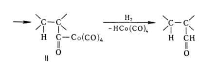 В случае гидроформилирования диенов на кобальтовых кат. гидрируется одна двойная связь и образуется моноальдегид, при использовании родиевых кат. образуется диальдегид. Механизм гидроформилирования включает стадии образования алкилметалл-карбонила (ф-ла I) и ацилметаллкарбонила (II), напр.: