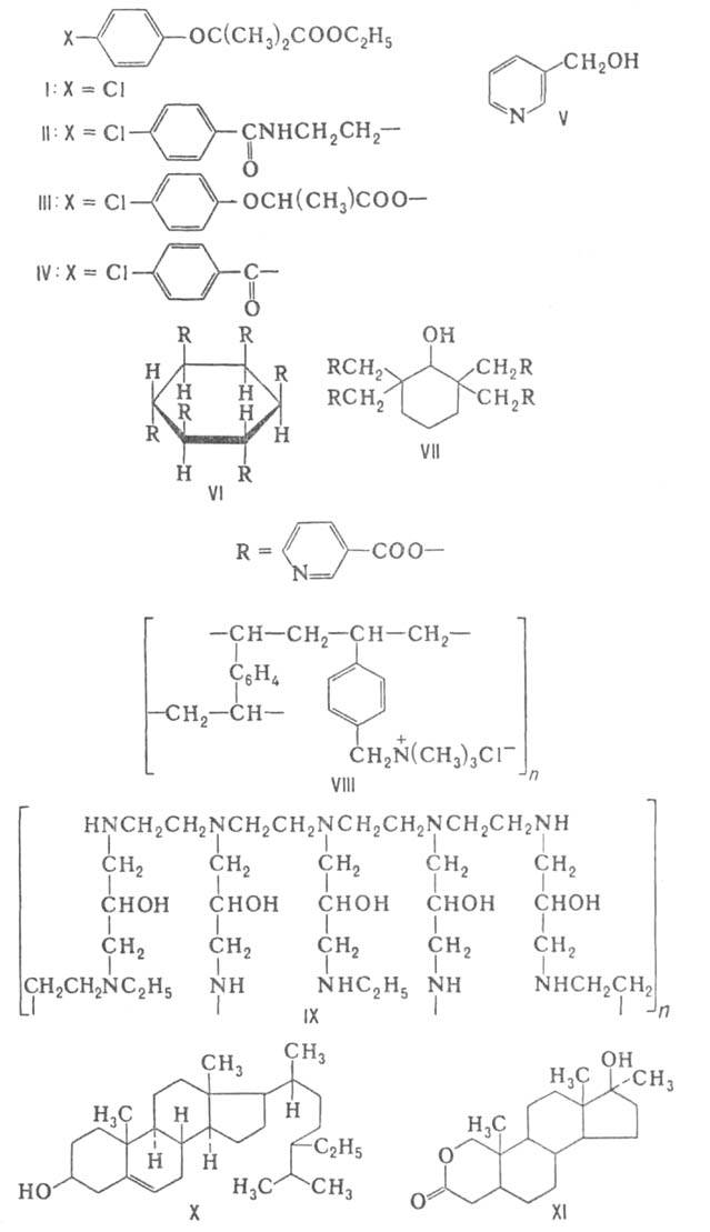 -ситостерин (X), D-тироксин, препараты ненасыщ. жирных к-т; 3) прочие ср-ва - гепариноиды, напр. атероид - смесь полисахаридов, выделенных из слизистой оболочки двенадцатиперстной кишки крупного рогатого скота, нек-рые анаболич. гормоны, напр. оксандралин (XI), а также фосфолипиды. Иногда гиполипидемические средства делят на всасываемые в кишечнике (напр., клофибрат, никотиновая к-та и их производные, D-тироксин) и невсасываемые (холестирамин, колестипол,