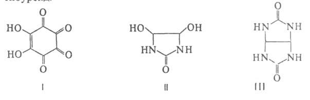 Глиоксаль окисляется воздухом в присут. К2СО3 в родизоновую к-ту (ф-ла I), Н2О2 и кислым р-ром КМnО4 - в муравьиную к-ту, щелочным-в щавелевую. При каталитич. восстановлении над Pd/C при 60 °С образует этиленгликоль. Со спиртами в присутствии минеральных кислот дает моно-и диацетали, с мочевиной при комнатной температуре -4,5-дигидроксиимидазолидон (ф-ла II) и глиоксальуреид (ф-ла III), с тиомочевиной в разбавленных НС1-глиоксальтиоуреид.