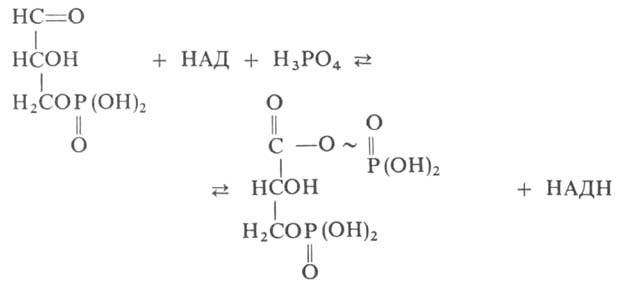 где НАД и НАДН-соотв. окисленная и восстановленная формы кофермента никотинамидадениндинуклеотида. Р-ция осуществляется в две стадии: 1) окисление 3-фосфоглицеринового альдегида, сопровождающееся ацилированием группы SH фермента и образованием комплекса глицеральдегидфосфатдегидрогеназы с НАДН; 2) перенос 3-фосфоглицерильного остатка на фосфорную к-ту. Энергия, высвобождающаяся на первой стадии, идет на образование макроэргич. связи (обозначена знаком ~) в 1,3-дифосфоглицериновой к-те.