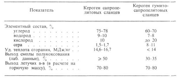 В сухом в-ве горючих сланцев содержится 50-80% неорг. в-в и 20-35% керогена (иногда до 50%). Минер. часть состоит из карбонатов Са (преимущественно), Mg, Fe, кремнистых и глинистых компонентов (кварца, полевых шпатов и сложных алюмосиликатов); встречаются включения FeS2, а также соединений Ge, Be, Sc и др. редких элементов. Кероген содержит ароматические, алициклические, а также орг. кислород- и серосодержащие соед.; практически не раств. в орг. р-рителях (см. табл.).