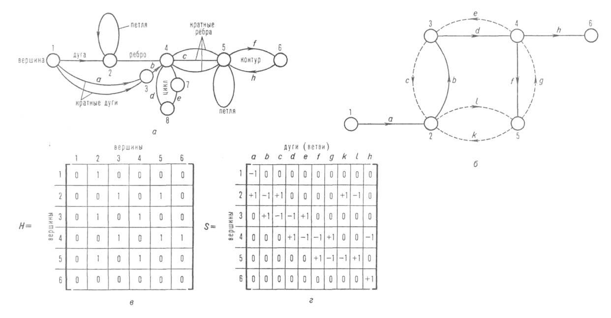 Некоторые основные понятия. Граф-совокупность точек (вершин) и совокупность пар этих точек (не обязательно всех), соединенных линиями (рис. 1,л). Если на графе линии ориентированы (т.е. стрелками показано направление связи вершин), они наз. дугами, или ветвями; если неориентированы,-ребрами. Соотв. граф, содержащий только дуги, наз. ориентированным, или орграфом; только ребра-неориентированным; дуги и ребра-смешанным. Граф, имеющий кратные ребра, наз. мультиграфом; граф, содержащий только ребра, принадлежащие двум его непересекающимся подмножествам (частям),-двудольным; дуги (ребра) и (или) вершины, к-рым отвечают определенные веса или числовые значения к.-л. параметров,-взвешенным. Путь в графе-чередующаяся последовательность вершин и дуг, в к-рой ни одна из вершин не повторяется (напр., a, b на рис. 1,a); контур-замкнутый путь, в к-ром первая и последняя вершины совпадают (напр.,f, h); петля-дуга (ребро), к-рая начинается и кончается в одной и той же вершине. Цепь графа-последовательность ребер, в к-рой ни одна из вершин не повторяется (напр., с, d, e); цикл-замкнутая цепь, в к-рой ее начальная и конечная вершины совпадают. Граф наз. связным, если любая пара его вершин соединена цепью или путем; в противоположном случае граф наз. несвязным.