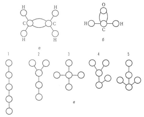 Рис. 2. Молекулярные графы и деревья: а, б - мультиграфы соотв. этилена и формальдегида; в-мол. изомеров пентана (деревья 4, 5 изоморфны дереву 2).