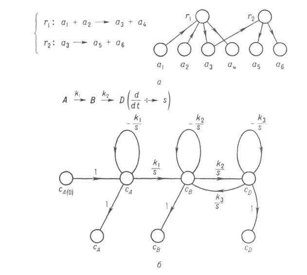 Сигнальные графы ур-ний кинетики р-ций отображают системы кинетич. ур-ний, представленных в алгебраическо-операторной форме (рис. 3,б). Вершины графов отвечают т. наз. информац. переменным, или сигналам, в виде концентраций реагентов, дуги-взаимосвязям сигналов, причем веса дуг определяются кинетич. константами. Такие графы применяют при изучении механизмов и кинетики сложных каталитич. р-ций, сложных фазовых равновесий при образовании комплексных соед., а также для расчета параметров аддитивных св-в р-ров.