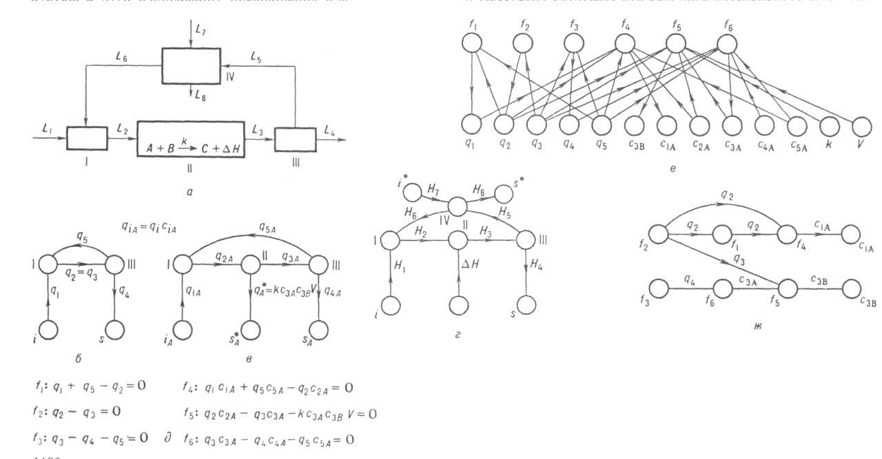 Рис. 4. Одноконтурная химико-технологическая система и соответствующие графы: а-структурная схема; б, в-материальные потоковые графы соотв. по общим массовым расходам и расходу компонента А; г- тепловой потоковый граф; д-фрагмент системы ур-ний (f1 - f6) материального баланса, полученной из анализа графов на рис. 4, б и в; е-двудольный информационный орграф; ж-информационный граф, I-смеситель; II-реактор; III-ректификационная колонна; IV-холодильник; I1-I8-технол. потоки; q-массовый расход; H-энтальпия потока; i. s и i*, s*- соотв. реальные и фиктивные источники и стоки материальных и тепловых потоков; с-концентрация реагента; V-объем реактора.