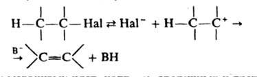 По этому механизму идет, напр., дегидрогалогенирования вторичных и третичных алкилгалогенидов в слабоосновных, но хорошо сольватирующих р-рителях (напр., в спиртах, воде, карбоновых к-тах). Механизм бимолекулярной р-ции можно записать в след. виде:
